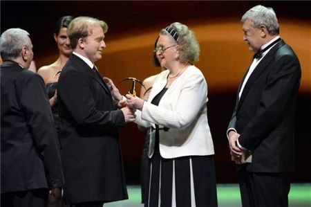 Jókai Anna átadja a Prima Primissima-díjat Lackfi Jánosnak (Fotó: MTI)
