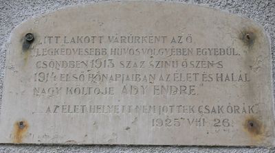 "Itt lakott várúrként az ő legkedvesebb Hűvösvölgyében egyedül, csöndben 1913 száz színű őszén s 1914 első hónapjaiban az élet és halál nagy költője Ady Endre" |