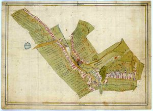 kéziratos térkép a jobbágyok neveinek feltüntetése mellett az épületek alaprajzát,