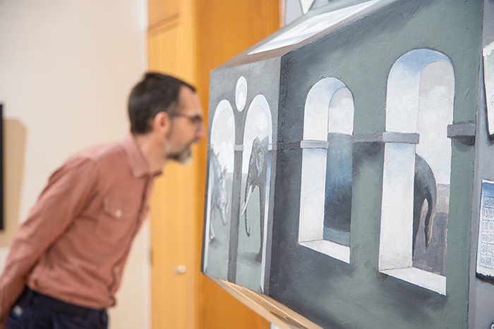 A megnyitón a művésszel Feledy Balázs művészeti író beszélgetett, aki az Orosz Istvánra jellemző kettősségeket emelte ki. „Képzőművész vagy irodalmár?” – tette fel a kérdést Feledy, hiszen Orosz Istvánnak mindkét területen jelentős a munkássága, utóbbiért éppen a napokban kapott József Attila-díjat. Irodalmi tevékenységében is jelen van a kettősség, egyszerre költő és művelődéstörténész, kutató, képzőművészként pedig az állókép éppúgy foglalkoztatja, mint a mozgókép.