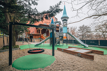 A beruházás során többek között az alsó udvaron vízi világot formáztak meg halakkal, vízparttal, kikötővel és egy többfunkciós hajóval, illetve egy hatszemélyes rugós csónakkal. A gyerekek falusi házat, két laphintát és egy fészekhintát is használhatnak.