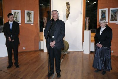 – Az edényeknek semmi közük nincs a tároláshoz, ezek gondolatokat, eszméket tartalmaznak: szellemi tárolóhelyek – fogalmazott Fekete György, aki a kerámiaképeket a művész ég és föld közötti lebegésének szimbólumaként dicsérte. – A képeket egymás mellé helyezve a glóbusz kiterített mását kapjuk. Nem más ez a sorozat, mint a feldarabolt mindenség. Az jut róla eszünkbe, hogy a világon nem vagyunk egyedül, részesei lehetünk a csodának. A valamiben való hitet mutatja meg a semmiben való hitetlenséggel szemben. A korongolt agyagedényeket, plasztikákat és kerámiákat felvonultató tárlatról