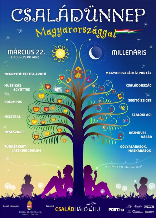 Ingyenes családünnep március 22-én 10-19-ig a Kolompos együttes, a Muzsikás és Szalóki Ági családi koncertjével, valamint többek között a Magyar Népmese Színház, a Misztrál és a Magonc együttes fellépésével. ![]() A közös élmény és együttlét szellemében rendezi meg a csaladhalo.hu a CsaládÜnnep Magyarországgal rendezvényt. A Millenárison reggeltől késő délutánig több helyszínen várják az érdeklődőket. Kicsiket és nagyokat arra buzdítanak, hogy ne csak szemlélői, de aktív szereplői is legyenek egy-egy színházi előadásnak, zenei produkciónak, sporteseménynek vagy kiállításnak. A Családi Színpadon a Kolompos együttes, a Muzsikás és Szalóki Ági családi koncertjét