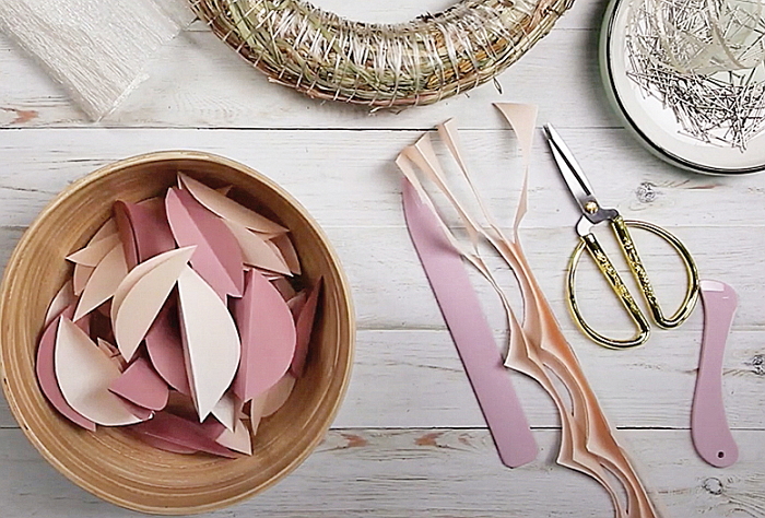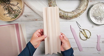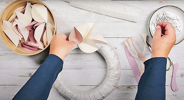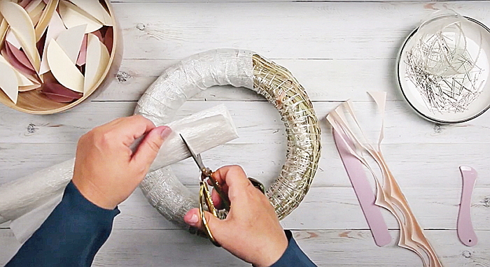 Vékony papírcsíkkal, például kreppel vagy selyemmel bevonjuk a koszorúalapot.