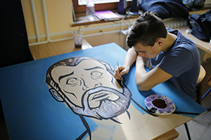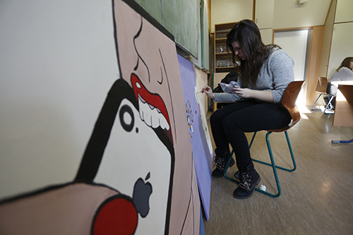 A Klebelsberg iskola tizedikes diákjaival január végén találkoztunk. A napsütéses teremben szól a zene, az asztalokon színes képek sorakoznak, némelyiken egyszerre hárman is dolgoznak. A táblának döntve egy projektorral megvilágított vászon, amelynek tulajdonosa határozott mozdulatokkal rajzolja rá a kivetített képet. Hamisítatlan műhely-hangulat. Sárkány Andrea vette rá tanítványait arra, hogy ecsetet ragadjanak. – A pop-art látványos, színes világ, olykor humoros, olykor polgárpukkasztó, könnyen azonosulnak vele a kamaszok. A Ludwig Múzeumban megnéztük világhírű művészek képeit – meséli a pedagógus, akinek tanítási módszerére nagy hatással volt egykori mestere, Bálványos Huba grafikus. Mint mondja, a projektet már a kezdetektől támogatta minden kollégája. Ez az összefogás is kellett ahhoz, hogy megvalósuljon a februári kiállítás, amelyre a 22 fős osztály hónapokon át készült. A képek témáiról az alkotók maguk dönthettek: internetes közösségi oldal logója, szuperhősök, italos és parfümös dobozok, Csillagok háborúja-szereplők, rajzfilmfigurák is vászonra kerültek. Az első sorokban két lány egy óriási piros tűsarkút fest: – Akrillal dolgozunk.