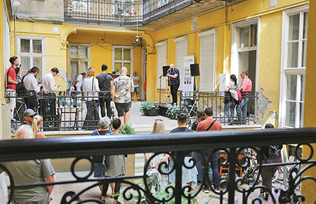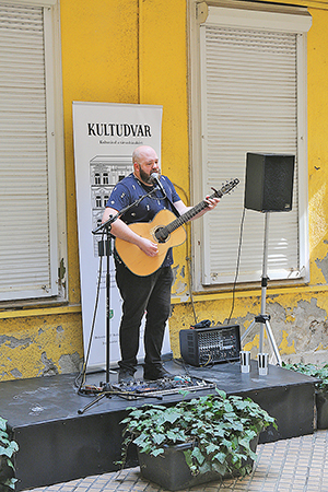 Hangácsi Márton az udvar kis színpadán, Őrsi Gergely polgármester köszöntőjét követően csapott a húrok közé. Nem maradt el a közös éneklés sem. A dallamokat hallgatva, az ódon gangok, a míves vaskorlátok, a régi ablakok és a sokat látott lépcsőház árnyékában sokan talán már látták is maguk előtt a megújult társasházat, amelynek felújításához a támogatói jegyek is hozzájárulnak.