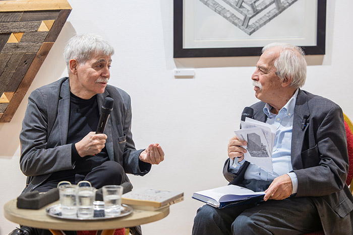 Orosz István elmondta, hogy irodalmár családból származik, és hogy irodalmi műveiben is mindig jelen van a képzőművészet. Jelenleg is egy 19. századi, osztrák születésű, magyar litográfusról, Grimm Vincéről ír, aki többek között a János vitéz 1845-ös első kiadásának rajzait készítette, és az első magyar sakkegyesület, a Pesti Sakk-kör első elnöke is volt. Azt is megtudtuk tőle, hogy a Deszkametriák-sorozat egy tetőcserének köszönheti létét, az abból maradt tetőlécek adták az ötletet a művész látványos, térbelinek tűnő alkotásaihoz. A beszélgetés során szó esett még a grafikust inspiráló művészekről, elsősorban Albrecht Dürerről, illetve az ő híres rinocéroszáról, amely többek között a most bemutatott Hommage à Valentinus de Moravia címet viselő legújabb műtárgy ihletője is volt, illetve Orosz István könyveiről, köztük a kiállítás címét is adó Távlattani leckék című verseskötetről.