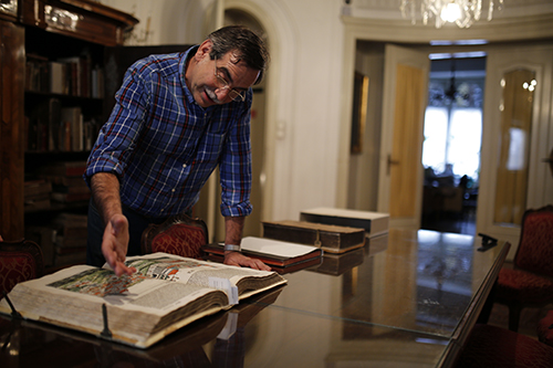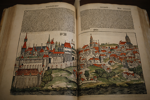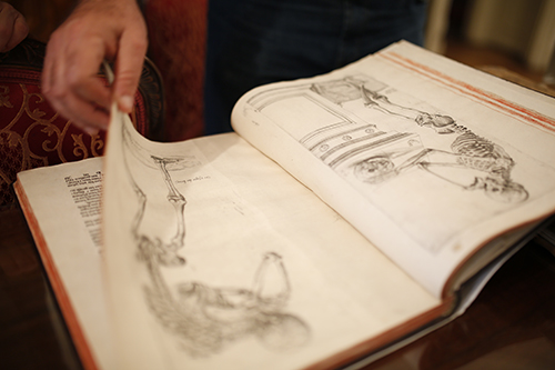 A muzeális művek közül melyek a legértékesebbek? Az igazgatóhelyettes elővesz egy hatalmas világkrónikát, amit Mátyás király halála után két évvel, 1493-ban Strasbourgban nyomtattak. Felüti a gót betűkkel írt Schedel-krónikát is és megmutatja a Budáról fennmaradt első ábrázolást. A kézzel kifestett krónikát annak idején négyszáz példányban nyomtatták ki, igazi bestseller volt. Megnézzük azokat a metszeteket is, amelyek az anatómia megteremtőjeként emlegetett Vesalius 1551-ben megjelent könyvében láthatók. A legértékesebb könyveket ritkán vesszük elő, például Hieronymus Braunschweig 1497-ben kiadott, gyönyörűen illusztrált sebészeti művét. Összesen tizennégy ősnyomtatványt (az 1450-es évektől az 1500-as évekig összerakható betűkkel, szedésnyomással készült művek – a szerk.) őrzünk, ezek a XV. században jelentek meg. Különleges az az 1553-ban megjelent könyvünk is, amibe belekötötték egy svájci természettudós, Conrad Gessner állattani könyvének ábráit. A könyvnek ez a példánya Magyarországra került, korabeli kéziratos magyar bejegyzések találhatók benne. Az ökörnél például a következő: „Ungarice ökör”. A rinocérosz szó magyar megfelelője azonban ekkor még nem létezett, ezért körülírták: „oly vad, kinek az orrából nőtt szarva”. Vannak híres szerzők által dedikált műveink és olyan Semmelweis-kötetünk is, amiben a magyar orvos kézírása látható.