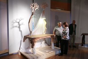 Sprok Antal különleges szoborbútoraiból nyílt kiállítás a Klebelsberg Kultúrkúriában május 3-án. A terem már a megnyitó előtt zsúfolásig megtelt a lelkes közönséggel. ![]() A vendégek ezúttal nem tartották be a „mindent a szemnek, semmit a kéznek” múzeumi szabályt, hanem bátran közeledtek a kiállított tárgyakhoz. A gyerekek azonnal birtokba vették a fából készült, selymesre csiszolt ülőgarnitúrát, és a felnőttek is hamar kipróbálták, hogy milyen belehuppanni egy olyan trónba, amely mögé egy kis fa nőtt. A fiókos szekrények tetejéről színes madárfejek néztek a látogatókra, az asztalon pedig könnyed, faragott terítő vonzotta a tekinteteket. Mindenkinek el kellett ismernie, hogy nagyon könnyű ezekbe a különleges, szemet gyönyörködtető szimbolikus használati tárgyakba beleszeretni.