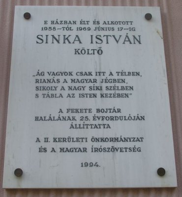 1957-ben elvált, és feleségül vette Szin Magdát, kései szerelmes verseinek ihletőjét. Az ő révén kaptak lakást a Keleti Károly utca 50. alatti Bauhaus ikerházban, melynek szimmetrikus bejárata a Kis Rókus utca 39/b. számot viseli. Már kikezdte egészségét az izom- és idegsorvadás, amikor 1961-ben megjelenhetett elbeszéléskötete, az Eltűnik a hóri domb. Sinka István 1969. június 17-én halt meg, miközben Szin Magda, aki betegségében mindvégig mellette volt, épp felolvasott a bibliából. A költő Farkasréti temetőben lévő síremlékét, a fából faragott Jézust Mónus Béla szobrászművész készítette. A „fekete bojtárt” csupán a rendszerváltás után rehabilitálták, 1990-ben posztumusz Kossuth-díjat kapott. Emléktábláját halálának huszonötödik évfordulóján a II. kerületi Önkormányzat és a Magyar Írószövetség avatta fel utolsó lakóhelye falán. |
