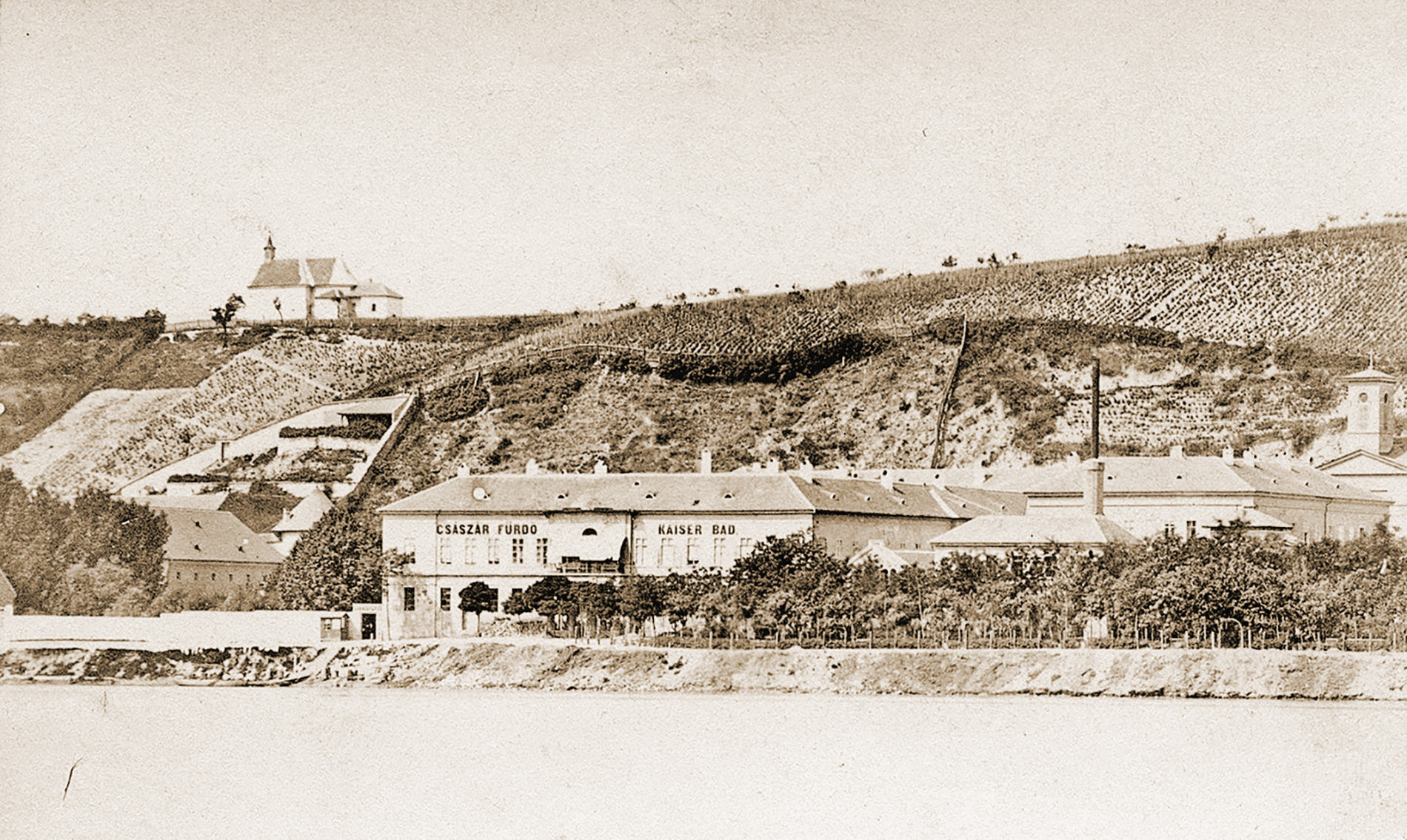 Újlaki rakpart, a Császár fürdő mögött a szőlő borította Rózsadomb és a Veronika-kápolna 1872-ben