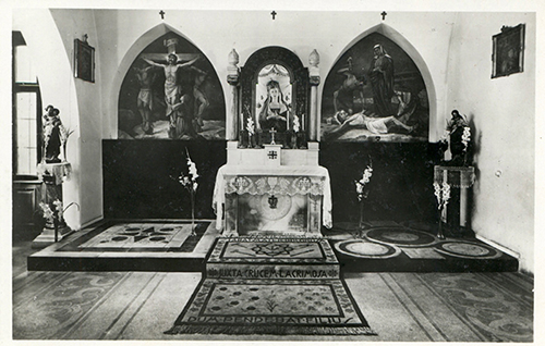 Ugyanebben az épületben egy különleges kápolna is létesült. Még 1937-ben keresték meg a rendet azzal, hogy nekik adományozzák Jeruzsálemből a Stabat Mater oltárt, azaz azt a carrarai márványból készült oltárt, amely a jeruzsálemi Kálvárián hosszú ideig azon a helyen állt, ahol a hagyomány szerint a keresztfáról való levétel után Mária ölébe vette Jézus testét. Mivel Jeruzsálemben ekkor új oltárt állítottak, felszedték a padlózatot fedő márványlapokat is, és azokat is elküldték Budapestre. Ezek a márványlapok 1130 óta fedték a Golgota szikláit, még a keresztesek idejében tették le őket, és azután megszámlálhatatlanul sok zarándok térdepelt rajtuk. Az ősi oltár és a kőlapok is a hűvösvölgyi Golgotai kápolnába kerültek, amelyet a villa szobáiból alakítottak ki. Megkapták azt a szekrényt is, amelyben a Fájdalmas Szűzanya világhírű kegyszobrát őrizték Jeruzsálemben, ebben a kegyszobor másolatát helyezték el. Majsai Mór visszaemlékezése szerint a Golgotai kápolna majdnem három hónapig készült, mert a márványoltár darabokban érkezett, és nehéz volt „a megszentelt márványlapoknak mozaikszerű kialakítása, amelyeket a keresztes vitézek még a XII. században raktak le a jeruzsálemi Kálvárián. Mikor ugyanis 1937-ben ezeket az igen elkopott márványdarabokat fölszedték, jó részük nagyon összetört. A régi fényképek alapján Molnár Farkas mérnökünk újra megrajzolta, és a kőfaragók két hónapig vésték a köveket, hogy azokból a régi rajzokat mozaikszerűen kirakhassuk.” A költségeket főként a hívek adománya fedezte, a kápolna pedig ezután nyilvános jelleggel működött, a környékbeli lakók rendszeresen ide jártak misére. 1940-ben a Golgotai Szűzanya szobrát meg is koronázták a Szent Korona pontos másával. A kápolna és a villa is átvészelte az ostromot, de később nem kerülte el az államosítást. Ma önkormányzati szociális bérlakások vannak benne és a hozzá tartozó melléképületekben. Majsai Mórt 1951-ben koncepciós perben elítélték, a Magyar Szentföld értékeinek jelentős része pedig sajnos elpusztult. Az ősi oltárt és a keresztesek köveit azonban sikerült megmenteni, azokat a Margit körúton őrzik. Viczián Zsófia |