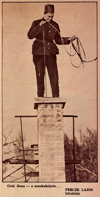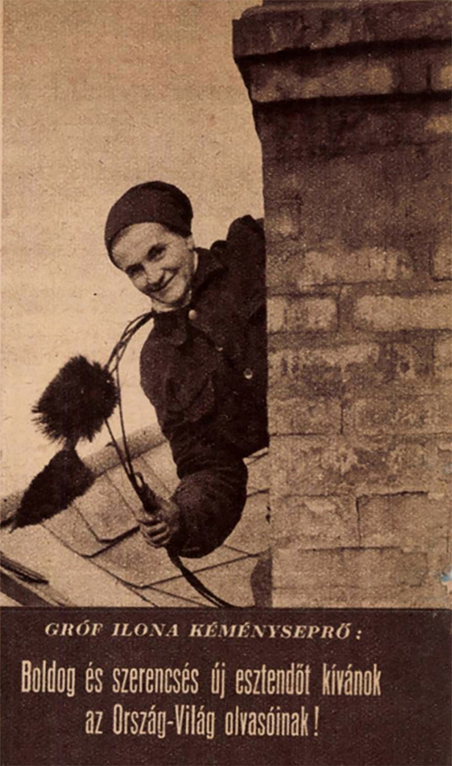 A háztetők fekete lovagja, fekete mester, szerencsehozó vagy szerencsefia, máshol füstfaragó – ezekkel a szóösszetételekkel utaltak a kéményseprőkre a hatvan-hetven évvel ezelőtti újságcikkekben. ![]() A pasaréti és a rózsadombi körzetekben aktív Gróf Ilona kéményseprőnőt viszont inkább „szerencsenéninek” hívták, jól ismerték és szerették a lakók. 1958-ban, amikor az Ország-Világ című lap bemutatta a hasábjain, még csak huszonhét éves volt, de már hetedik éve tisztította a II. kerületi kéményeket. Akkoriban sem volt megszokott, hogy egy nő hasonló munkát vállaljon, így szívesen írtak róla az újságok, dicsérve külsejét, ügyességét, ahogy a fekete hajú, barna szemű, „párduc termetű, csupaizom fiatalasszony”, aki soha életében nem szédült és nem volt tériszonya, a háztetők vékony pallóin egyensúlyoz. Egy időben az egyetlen nő volt a vállalatnál („vagy talán egész Európában?”), szinte a csodájára jártak. Emellett sok kollégája vélekedett úgy, hogy szép-szép, de mégsem neki való szakma ez, mert a nőket a férfiak sem a „kormosban” szeretik látni, sőt volt, aki kijelentette, hogy szerencsét csak férfi kéményseprő hozhat. (Érdekes Ujság, 1957. XII. 28.)