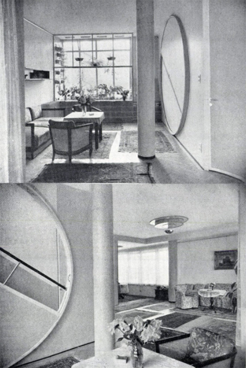 Molnár Farkas feladata nemcsak a környék egyik legértékesebb saroktelkének gazdaságos beépítését, hanem a lakások értékesítését is magában foglalta, és mivel ez utóbbit még az építkezés előtt meg kellett kezdenie, olyan megoldást keresett, ami ad valami pluszt a lakáskeresőknek és „az építtetők egyik legmélyebben fekvő igényét elégíti ki”. Itt ez a tágas és különösen széles helyiségeken kívül a lodzsák egymástól való teljes elkülönítése volt. Az eredeti terveken „társas villa”-ként feltüntetett ház Pasaréti úti homlokzatán Molnár a lodzsákat a virágládákkal együtt sakktáblaszerűen osztotta el. Ez a kialakítás a mai napig megmaradt, a műemléki védettség feltehetően megakadályozta az esetleges változtatásokat. De arra is gondolt, hogy a falfelületek borús időben is elváljanak egymástól, így a homlokzati felületeket felváltva fehér és halvány világoskék színűre vakolták. A Pasaréti útra néző társasház mindhárom emeletén egy négy- és egy háromszobás, az alagsorban két garzonlakást alakítottak ki, a különálló Trombitás úti villa eredetileg egy kétszintes lakást foglalt magában. 1936-ban, Az Est című lapban megjelent hirdetésben Buda legszebb telkén, „tökéletes kivitelű társasházban” hirdettek eladó luxuslakásokat külön kertrésszel, minimális közös költséggel, vastag betűvel szedve, hogy „gyönyörű kilátással”. A Pasaréti útra a lakószobák, míg a túlsó oldalra a háló-, fürdő-, cselédszobák és a konyhák néztek. És ha a kilátást a mai viszonyok között nem is gondolnánk páratlannak, hiszen nem foglal magában lélegzetelállító dunai panorámát, és a Pasaréti út forgalma is minden bizonnyal nagyobb lett az elmúlt kilencven évben, a homlokzat kiképzése és az utcáról nem látható, belső részletek mindenképpen egyedülállóvá teszik az épületet. A társasház egyik különlegessége az előcsarnok oldalfalán látható, színes üvegburkolattal készült, az építésznek egy korábbi, absztrakt-konstruktivista festményét reprodukáló kép. Ha megfelelő szögből süt a nap, a bejárati ajtó kör alakú, színes üvegbetétjein keresztül mesés fényhatás érvényesül. A Trombitás úti épületben egy másik rendhagyó megoldást alkalmazott Molnár. A szintek közti belső közlekedésre szolgáló lépcsőt egy S alaprajzú ajtó átnyitásával és egy három méter átmérőjű, félkörű tárcsa átfordításával a lakótértől teljesen leválaszthatóvá tette. De nézzük, kik voltak az épületek megrendelői, és milyen részletek utalnak ma is rájuk. A földszint tervén a nagyobb lakásban egy orvosi rendelő látszik, talán ez készült a megbízó, dr. Pekanovich István orvos, egyetemi magántanár, az Országos Társadalombiztosító Intézet tüdőbetegkórházának igazgatója számára. Az orvosprofesszor egy kollégája lányát, Okolicsányi-Kuthy Editet vette feleségül, az ingatlant is közösen vásárolták, és adták el a tulajdonjog egy részét 1936 júniusában dr. Bajai Ernőnek és nejének, akik a különálló villát vették birtokba. Az építkezés 1937-ben fejeződött be és maga a kivitelező építész, Poros István is vett itt lakásokat, nevét Molnár Farkaséval együtt a Trombitás úti homlokzaton örökítették meg. Pár évvel később Bajai egy sokat foglalkoztatott tervezővel, Vincze (Weiss) Pállal készíttette el a villa modern stílusú berendezésének terveit, ezeket a mai napig végig lehet nézni az Iparművészeti Múzeum gyűjteményében.