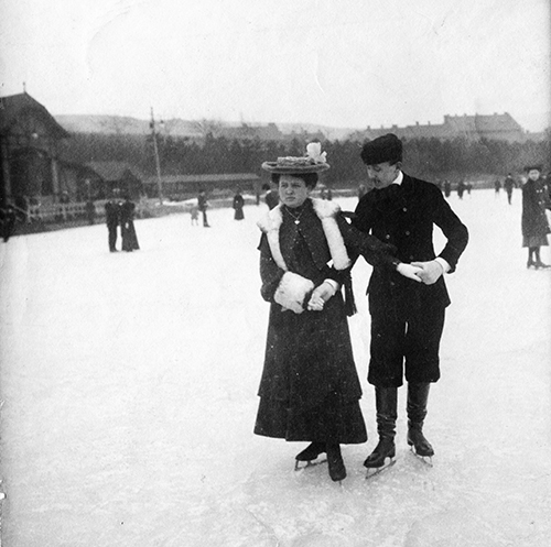 Az egykori Széll Kálmán téri korcsolyapályáról. ![]() A fővárosban telelő úri társaság kedvelt szórakozása volt a korcsolyázás. A kép bal szélén a háttérben a klubház látható ezen az 1916-ban készült képen (fotók: Fortepan) „Van a sportnak egy neme, melynek nyara ép a csikorgó tél, és eleme a jég, ez a korcsolyázás nemes élvezete. Egy szép téli napon, midőn a napsugár ködfelleggel küzd, s szinte birkózva tör magának utat, hogy a jég sima tükrén mosolygó arcában gyönyört találjon, midőn a fa és bokor, fürt és ősz szakáll a zúzmara kristályától egyaránt fénylik, s a hévmérő 6 fok hideget jelez, egy ily napon a szűz jég sima felületén végiglejteni oly élvezet, mely szinte a repüléssel határos” Ezt írta költői lelkesedéssel 1870 telén a Vadász és Versenylap. Az apropó legalább ennyire lelkesítő volt: megindulni látszott a pest-budai korcsolyázóélet! A fővárosban telelő úri társaság kiváló, előkelő szórakozásra lelt a városi korcsolyázásban. Az első egyletek az 1860-as évek végén alakultak meg (az inspiráció Bécsből érkezett), 1873-tól pedig a Budapesti Korcsolyázó Egylet fogta össze egy szervezetbe a jeges sport kedvelőit. A budai korcsolyázóegylet alelnöke dr. Országh Sándor (a fővárosi közmunkatanács osztályvezetője) volt, elnöke pedig Lipthay Béla báró. Rendes tagnak 18 évesnél idősebb férfiakat és 15 évesnél idősebb nőket vettek fel, nekik éves tagdíjat kellett fizetni. Bár csak ajánlással lehetett tagsághoz jutni – ez biztosította az előkelőség fenntartását –, így is hamarosan több ezer tagot számlált az egylet. A budapesti korcsolyázás messze földön híres, valóban páratlan szépségű jégpályája a Városligetben volt. Első korcsolyacsarnokát az akkor még fiatal, de nagyon tehetséges építész, Lechner Ödön tervezte 1875-ben. Bár ezt az épületet 1893-ban lebontották, a helyére épült neobarokk csarnok (Francsek Imre) máig álló épülete is igen előkelő és látványos helyszín lett és maradt. Azonban nem csak a pestieknek volt szép pályájuk: Buda is büszkélkedhetett egy remek adottságú korcsolyázóhellyel, amely hamar szintén igen népszerűvé vált. Ez – ki gondolná ma – a mostani Széll Kálmán tér helyén állt. Hivatalosan 1895-ben vehette birtokba az előkelő közönség, de valójában már korábban is volt itt egy nem olyan szépen kiépített, de azért használható pálya. Mégpedig az egykori téglavető gödre szolgált alapul a téli sikláshoz már az 1870-es évek elején is. Akkoriban még nem volt gond a felmelegedés: a téli hónapok hosszan tartó fagyos időt hoztak, mesterséges hűtésre nem volt szükség. A Széll Kálmán tér környékén több helyen is működtek téglavetők (a Mechwart liget területe is az volt), a környéket a Közmunkatanács javaslatára az 1880-as években kezdték el rendezni, amikor kiépítették a budai körutat. Ma is érzékelni az egykori Moszkva téren, hogy régen miért hívták egyszerűen csak „Gödörnek” a budaiak. Fel is kellett tölteni, miután a téglagyárak bezárása után a Budapesti Torna Egylet (ismert rövidítéssel a BBTE) kapta meg. A gödörjelleg jót tett a sportnak: védte a jeget és a korcsolyázókat az erősebb szelektől. Sokáig nevében még őrizte a téglavetős múltat: az egykori téglagyár után Christen-féle teleknek nevezték. A fővárosi közgyűlés 1895-ben döntött a telek betöméséről, és arról is, hogy azt a Budai Korcsolyázó Egylet kapja meg használatra a következő tizenöt évre. Hamarosan, 1897-ben fel is állították itt a BBTE első klubházát: egy csodálatos favázas épületet. Igazi újrahasznosítás volt ez, hisz ez az építmény az előző évben a városligeti millenniumi kiállításon még vendéglőként, sörkóstoló pavilonként működött, de korcsolyafelkötőnek, öltözőnek, sőt, zenekari teremnek is kiválóan megfelelt új budai helyén. A Vasárnapi Újság 1901-ben lelkendezve írta róla: „Nagy melegedő és társalgó helyiségen kívül van benne ruhatár, orvosi, választmányi és irodai szobák: továbbá büffet s külön férfi és női Jackson Haines korcsolya-felkötő helyiségek. Azon kívül van még korcsolya- és szertár, gondnoki lakás, kamrák stb., az emeleten pedig alkalmas térség s melegedő szobák a katonai zenekar részére.”