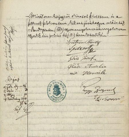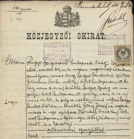 1881. július 12-én szántófölddel és erdővel gyarapodott az asztalosmester birtoka. Az adásvételi szerződést ismét Rupp foglalta írásba, a szerződés szerint Spitzer Ezechielné, született Goldstein Berta úrhölgy, továbbá Spitzer Ignác úr, magánzó, mint néhai Spitzer Sándor örököse eladta Glasz Józsefnek a budai 6495-ös számú telekjegyzőkönyvben foglalt, 6242-6246/b helyrajzi számú erdőt a Báthory-hegyen, a közösen megállapított 1250 forint vételárért. A tévesen szereplő „Báthory-hegy” a korábbi Lindenberg volt, és Döbrentei Gábor dűlőszentelője során 1847-ben kapta a Bátorhegy nevet, a magyar nyelvben viszont a Lindenberg tükörfordítása, a Hárshegy terjedt el. Glasz József asztalosmester, földbirtokos 1883-ban halt meg. Életkorát nem jegyezték fel, házastársa ekkor negyvenöt éves volt. Végrendeletét március 1-jén hirdették ki. Özvegy Glasz Józsefné, „úrnő, magányzónő” – akinek továbbra is a kültelki Országos Tébolyda biztosított lakást – 1887. október 17-én megvált az erdőtől. Deutsch Károly magánzó 2700 forintot fizetett az erdőért, amiből Glasz Józsefné házat vett Óbudán, a Kiscelli utcában. 1906. február 11-én halt meg, három gyermekétől tizenhárom unokája született. A hidegkúti földműves, Noob Ádám Nyéki-dűlőben fekvő (7362-7363 helyrajzi számú, összesen 10 499 négyszögöl kiterjedésű) telkét 1908 őszén a fővárosi közgyűlés (a pénzügyi és gazdasági bizottmány, valamint a tanács javaslatára) a fővárosi erdőterület kiegészítése céljára kisajátította, a kártalanítási összeget pedig 50000 koronában állapította meg. Nyílhegyi Rupp Zsigmond közjegyző, a budapesti királyi közjegyzői kamara elnöke, akinek irattárában megmaradtak a fent idézett míves nyelvezetű dokumentumok, 1917. augusztus 8-án hosszú, kínos szenvedés után, életének nyolcvanadik évében, legkedvesebb tartózkodási helyén, Budakeszi úti nyaralójában hunyt el. Verrasztó Gábor |