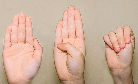 A mozdulatsor három lépésből áll: először a nyitott tenyér mutatása, majd a hüvelykujjat a nyitott tenyérbe kell hajtani, végül a négy másik ujjat rákulcsolni.