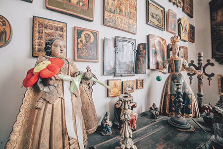 Sok érdekes naiv fa- és kőszobor is található a gyűjteményben, a legtöbbhöz regényes történet is kapcsolódik. „Itt van ez a kőszobor, Szent József a gyermekkel, olyan 18. századi lehet, de lehet, hogy még régebbi. Nógrádban az egyik gyűjtőúton csak úgy az autóból megkérdeztem a kerítésen át, hogy asszonykám, nincs-e valami szép szobor. Azt mondja, kőbül van egy, itt van a ház előtt. Bementünk, és a ganajban tényleg ott feküdt ez a szobor. Könyörögtek, hogy vigyem el, mert valahányszor a tehénhez bejönnek, a nagylábujjukat beleverik. Fizettem valamit érte, betettük hátra a kocsiba, olyan nehéz volt, mire hazajöttünk, beszakadt a kocsi alja. Szóval ez így lett megmentve.” Román Panni kivételes érzékkel látta meg, mi a valódi érték, és ehhez az is kellett, hogy könnyen tudott kapcsolatot teremteni. „A román asszonyok nekem kezet csókoltak. Eleinte persze elkaptam a kezem, de láttam, hogy nagyon rosszul esik nekik. Rájöttem, mit kell csinálni: hagytam, hogy megcsókolják a kezem, aztán átöleltem őket, és arcon csókoltam őket. Volt olyan, akinek könnybe lábadt a szeme.” A gyűjteményt néhány éve a Néprajzi Múzeum megvette és gondosan leltározta. Román Pannit a kivételes szépségű tárgyakon túl ma is sok barát veszi körül, élete a beszélgetés. Tavaly például születésnapjára ötvenfős lakásszínházi előadást szerveztek. Kifogyhatatlan mesélő. „Addig élek, amíg van olyan értő és hallgató fül, akit ezek a múltbeli dolgok, a történeteim érdekelnek.” Viczián Zsófia