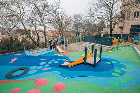 A beruházás során többek között az alsó udvaron vízi világot formáztak meg halakkal, vízparttal, kikötővel és egy többfunkciós hajóval, illetve egy hatszemélyes rugós csónakkal. A gyerekek falusi házat, két laphintát és egy fészekhintát is használhatnak.